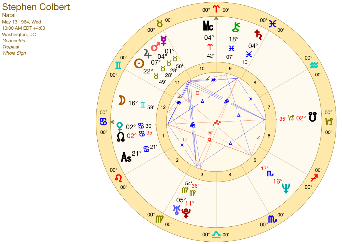 The limits of Taurus are of her own making. She can only receive in accordance with the pheromones she sprays into the air. Colbert sprays a variety of characters into the 11th. Sun, Jupiter, Mars and Mercury all are in attendance.